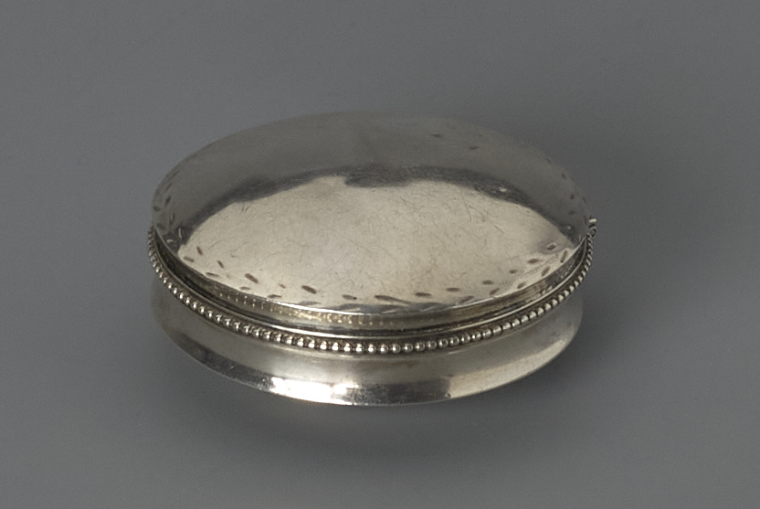Ronde pillendoos, sluitrand deksel met parelrand en vergulde binnenkant.