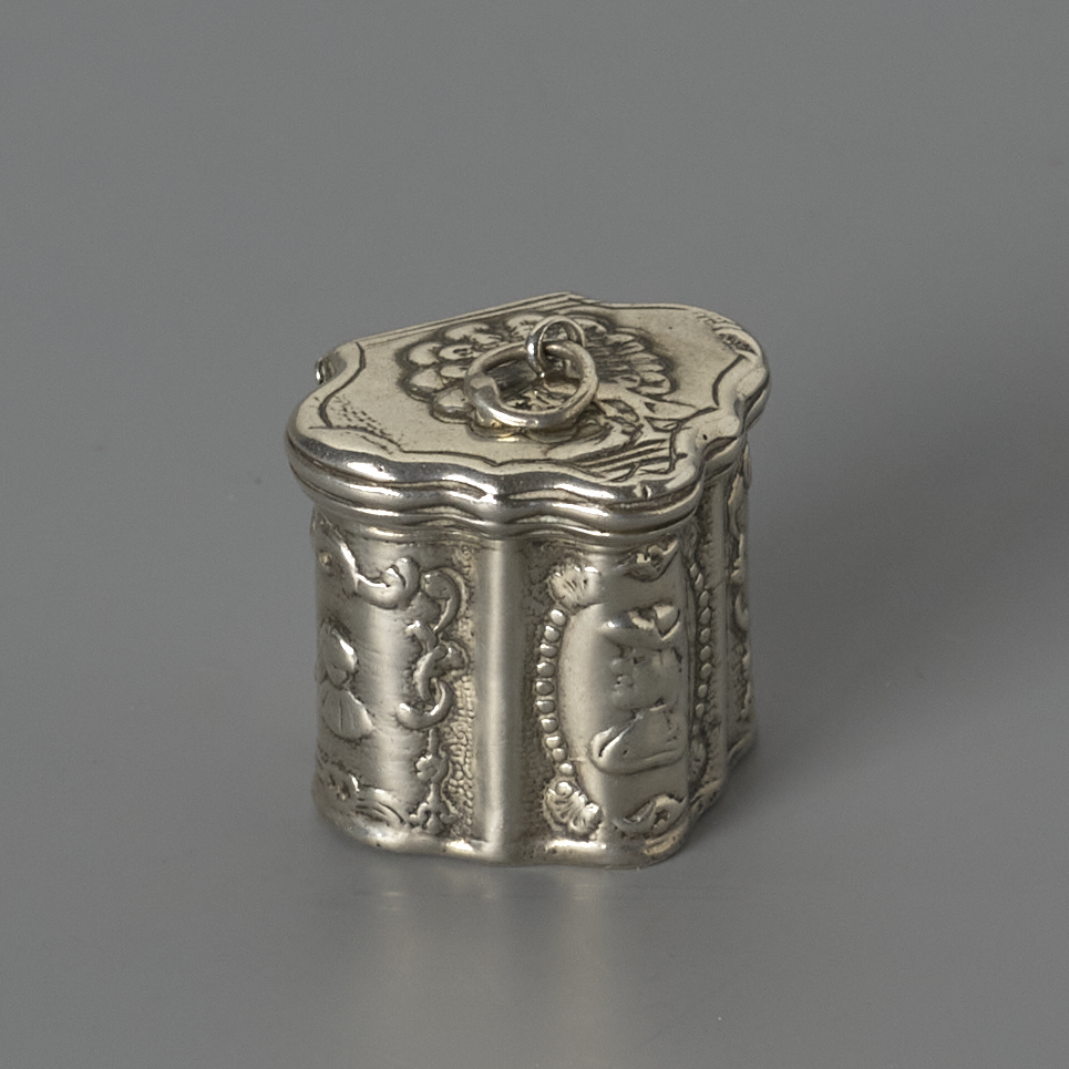 Cartouchevormig lodereindoosje scharnierend deksel versier met een pauw. De wanden voorzien van mannen- en vrouwenafbeeldingen in cartouches.