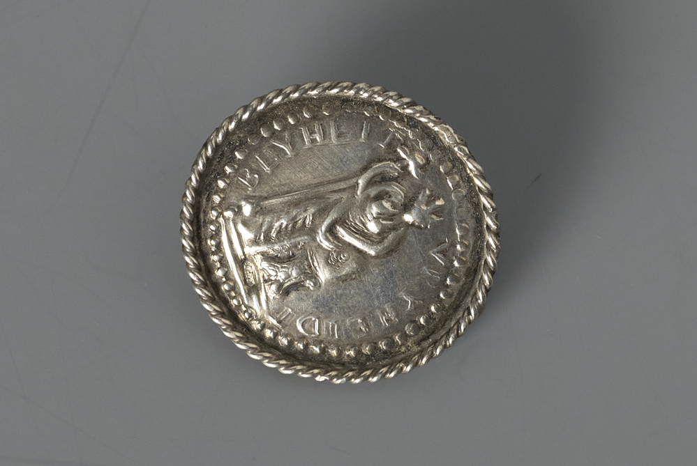 Ziveren ronde knoop met koord omranding rondlopende tekst om stand figuur met buste en vrijheidsboom.- Trefwoorden