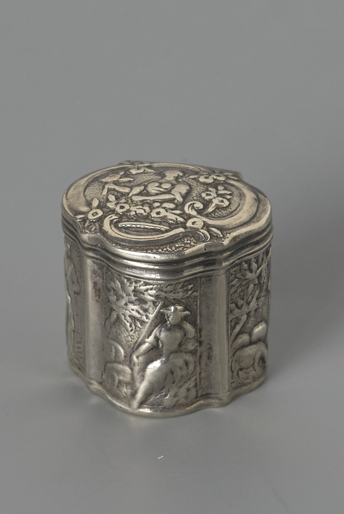 Cartouchevormig doosje met scharnierend deksle en pastorale scenes in voluutvormige cartouches.- Trefwoorden