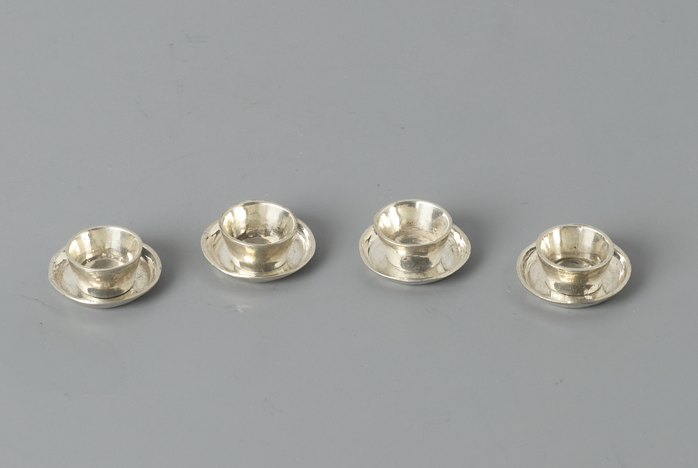 Vlakke schotel met lage rand, koppen met conische vlakke wand.