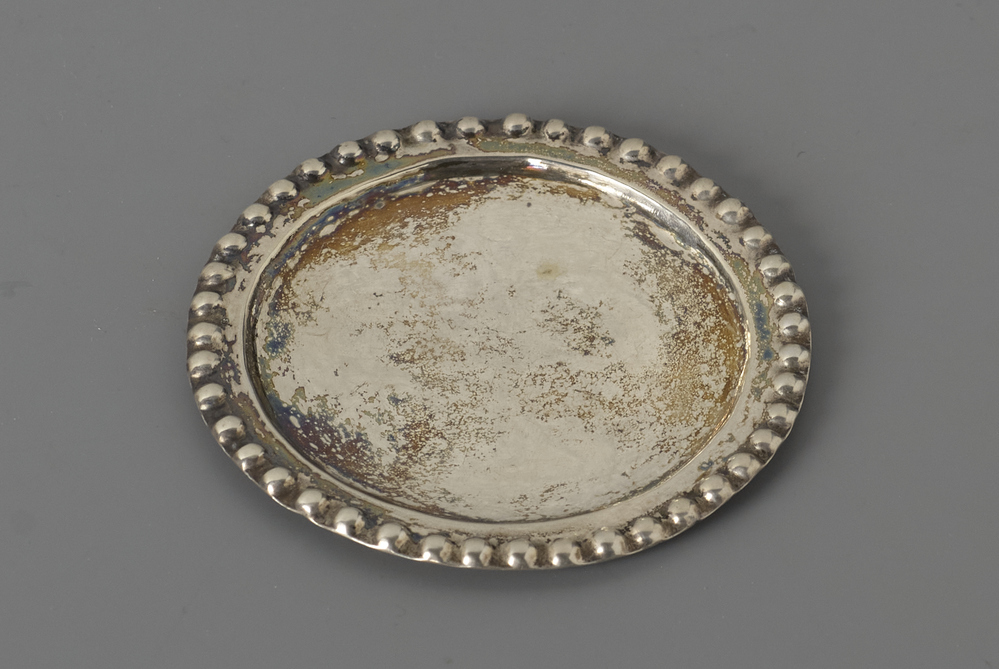 Rond dienblad versierd met een parelrand.- Trefwoorden
