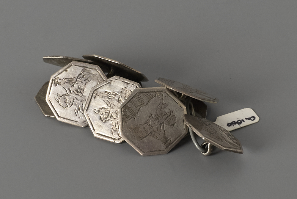 Achtkantige livreiknopen met een gegravering van een ruiter op een paard.- Trefwoorden