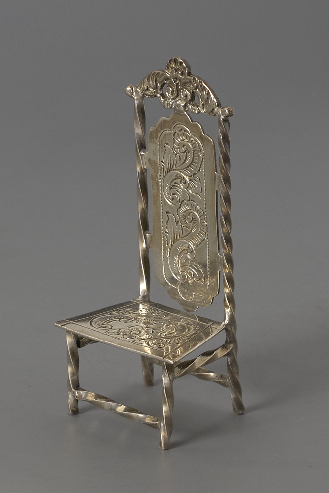 Stoel met gedraaide poten, rug en zitting versierd met C-voluten en florale motieven.- Trefwoorden