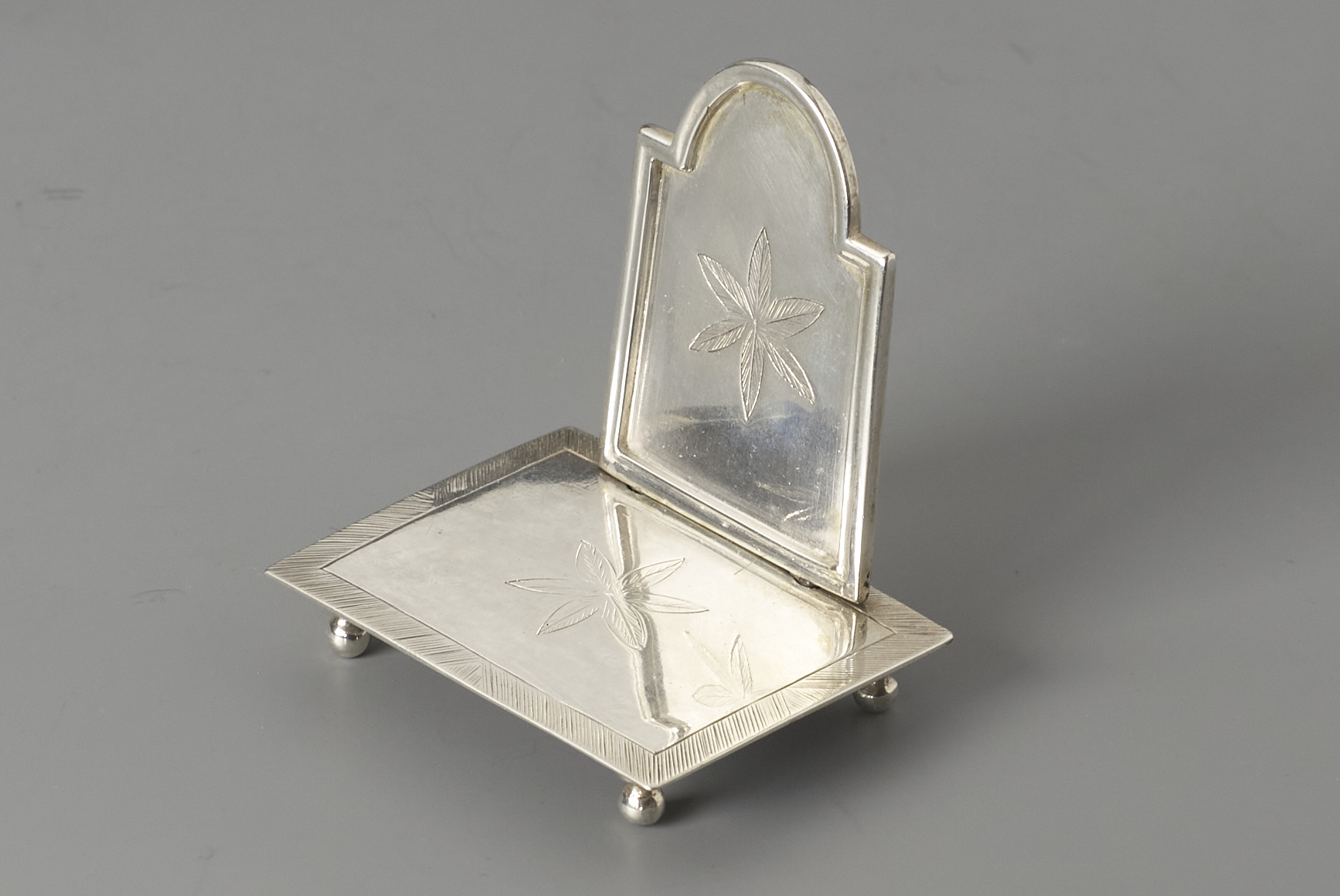 Rechthoekige haardplaat op vier bolpoten en rechthoekig scherm met halfronde bovenzijde. Beide onderdelen versierd met een gestyleerde, gegraveerde bloem.