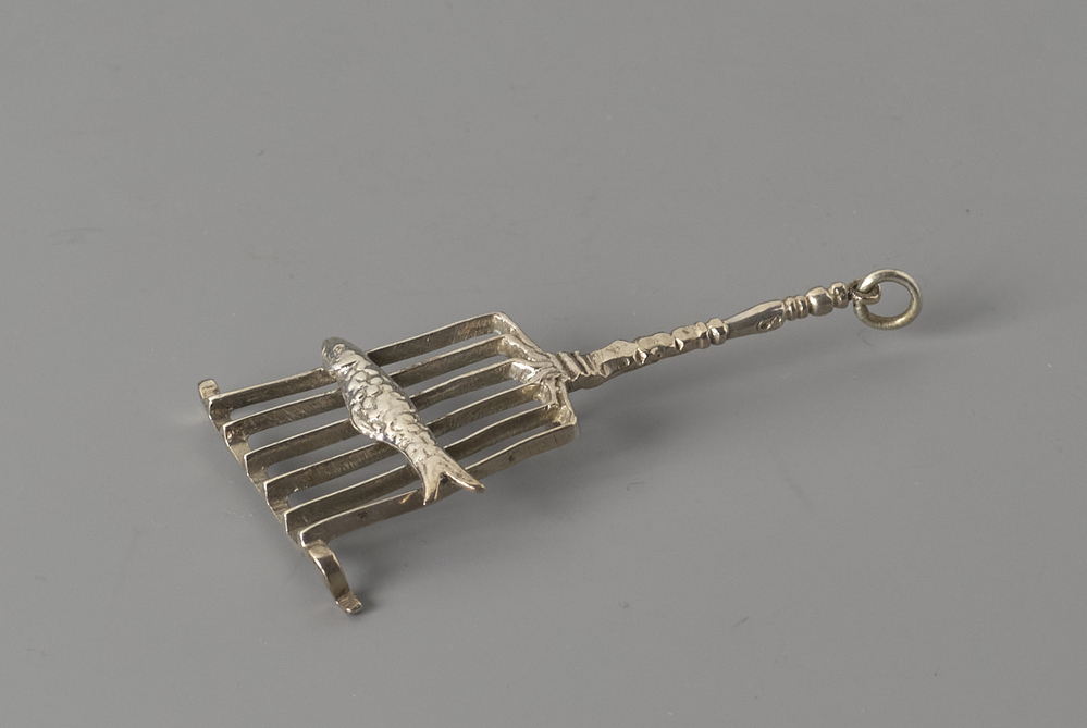 Rooster op drie poten en een handvat met aan het uiteinde een ring. De treeft heeft zes spijlen met daarop een vis.
