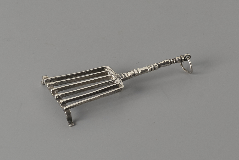 Rooster op drie poten en een geprofileerd handvat met aan het uiteinde een ring. De treeft heeft zes spijlen.- Trefwoorden