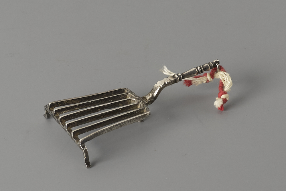 Treeft op drie poten met zes spijlen, met geprofileerde greep en ophangoog.