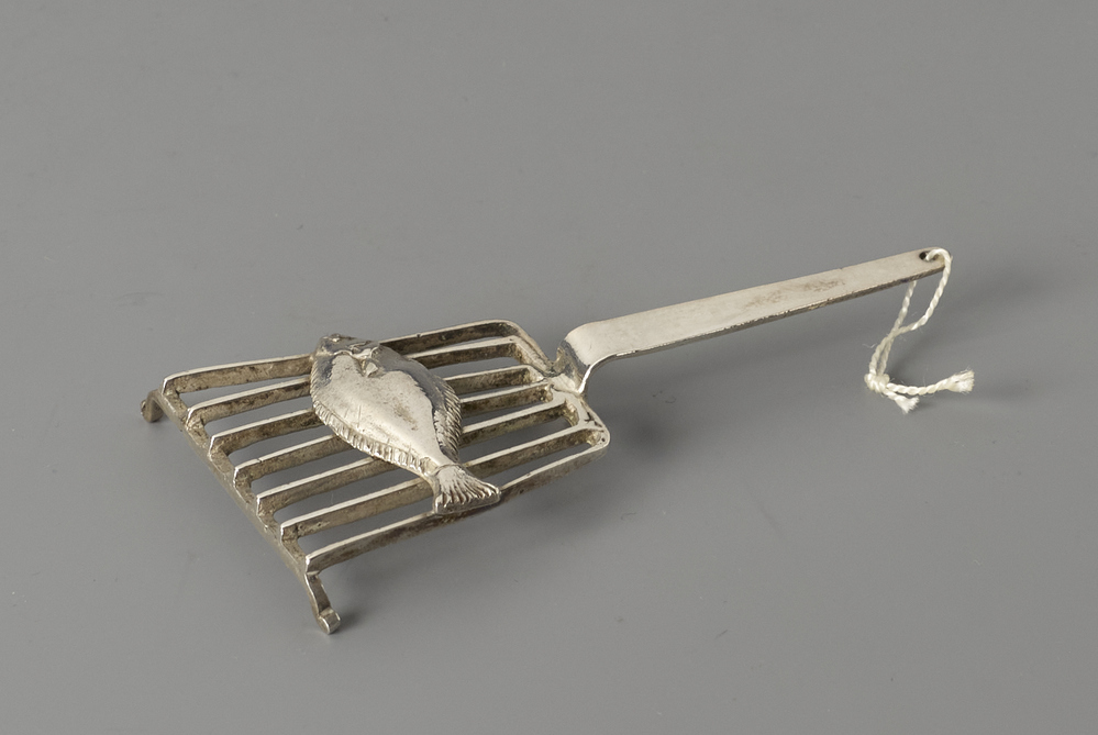 Rooster op drie poten en een handvat met aan het uiteinde een ring. De treeft heeft zeven spijlen met daarop een brede, platte vis.