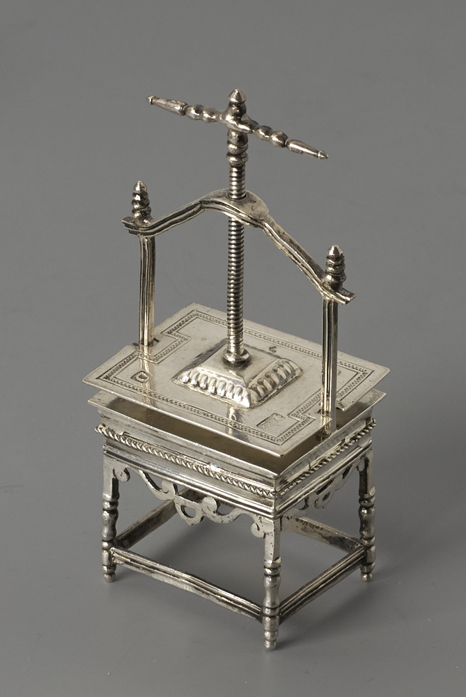 schenking 2020 inv.nr. 5763 in depot Linnenpers op vier balustervormige poten en opengewerkte bovenregel. Het bovenblad van de pers heeft een gegraveerde zig-zag lijn langs de rand.