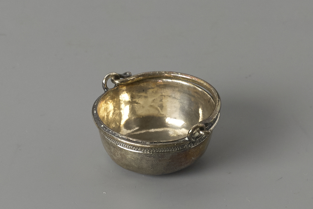 Ronden kookpot met scharnierend hengsel, onderzijde gegraveerd met florale motieven.- Trefwoorden