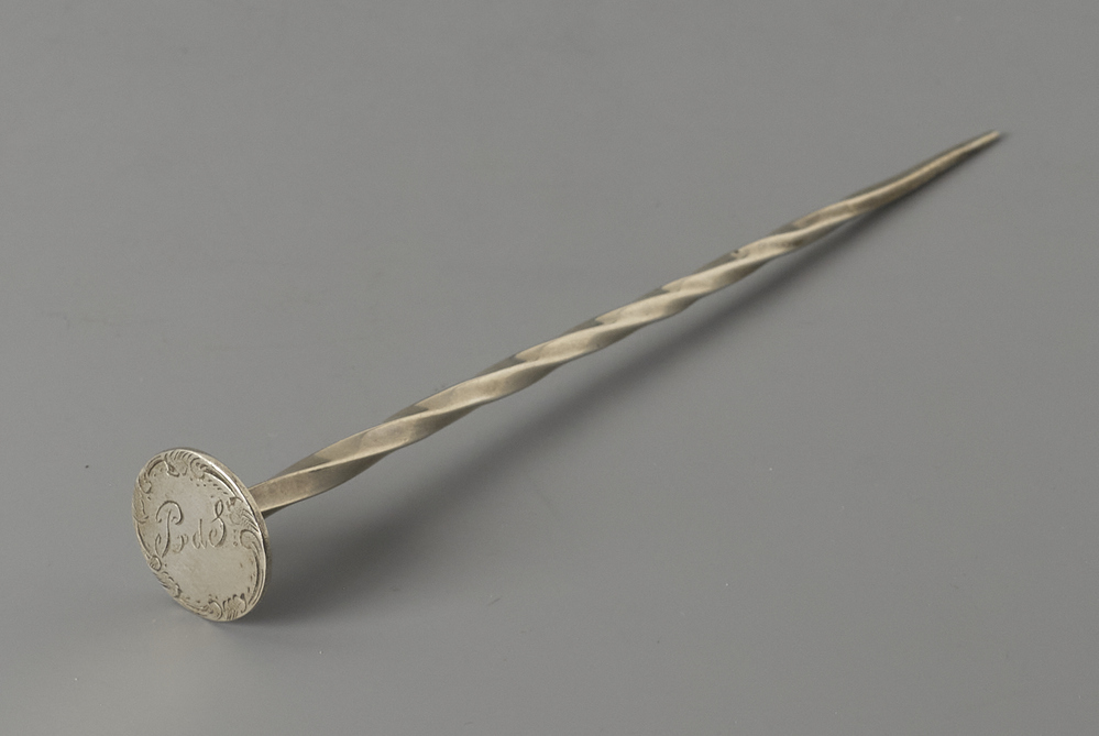 Pijpenwroeter met getorste steel, de schijfvormige bovenkant gegraveerd: P. v d S- Trefwoorden