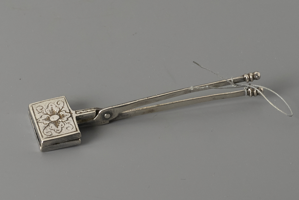 Wafelijzer met rechthoekige ijzers, versierd aan de buitenzijde met gegraveerde bloemen, de binnenzijden zijn geruit.- Trefwoorden