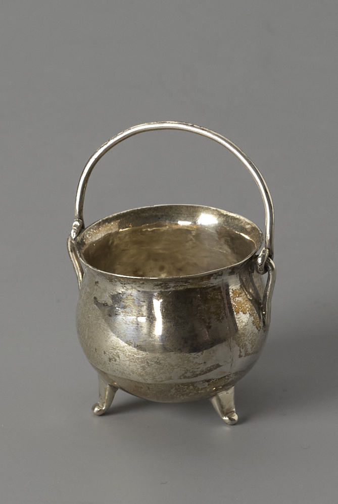 Bolvormige kookpot op drie pootjes met hengsel.- Trefwoorden