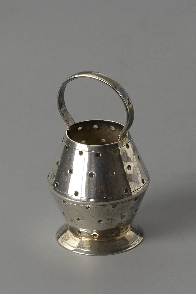 Viskorf, dubbelconische emmer op een ronde voet. In de wand zijn zes rijen gaten en gegraveerde lijnen. De emmer heeft een rond, vast hengsel.