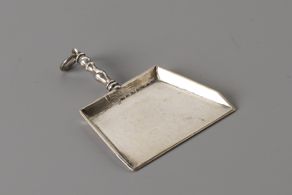 meesterteken onderzijde "schep": lijkt op: Johannes Adrianus van Geffen, werkzaam van 1766 tot voor 1798 ; Bron: Citroen 1975, nr. 1218; Voet 1912, nr. 487; Duysters 1999, nr. 25 : bekroond hartvormig schild met hoorn