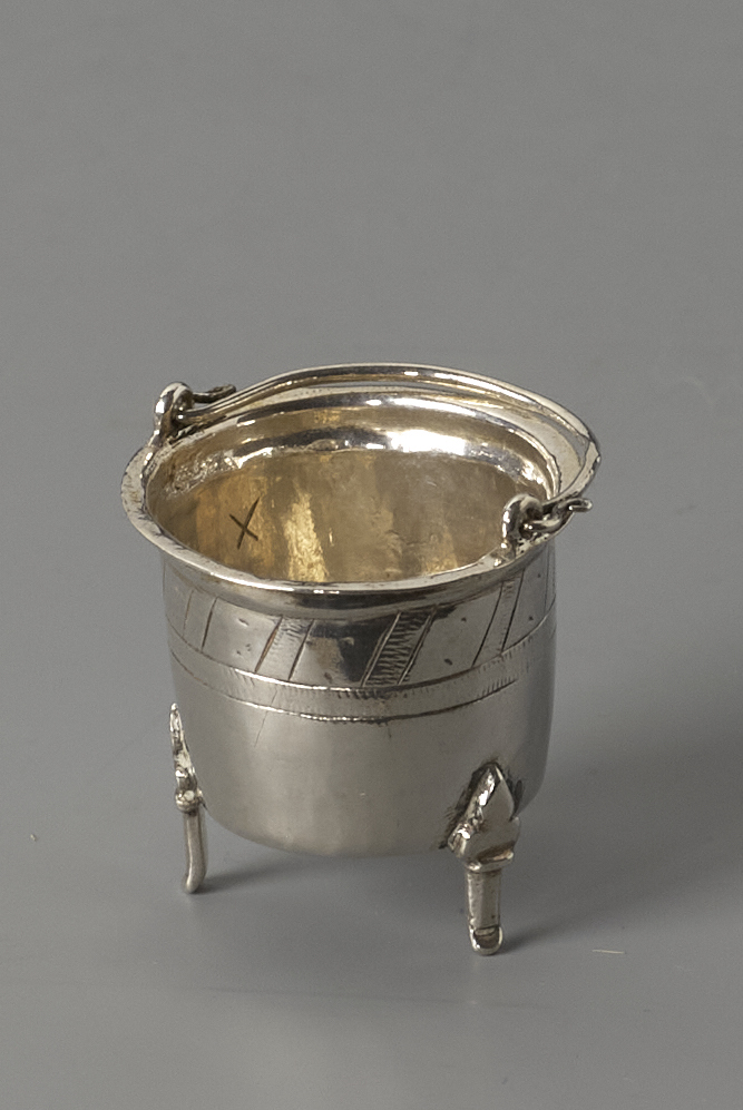 Kookpot op drie pootjes met hengsel en geometrisch band.