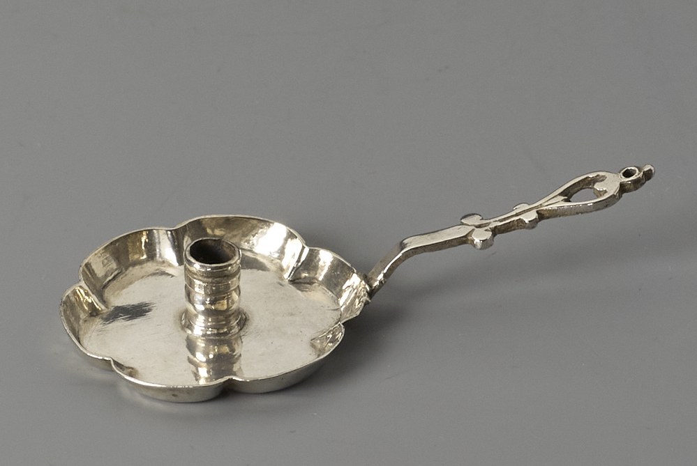 - meesterteken onderzijde steel, 2x: lijkt op: Wessel Jansen, werkzaam van 1642 tot 1696; Bron: Voet 1912, nr. 59; Citroen 1975, nr. 903 : W : Vals?