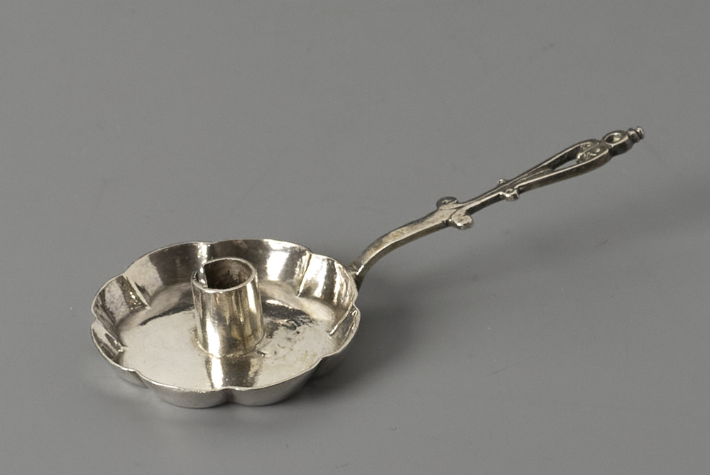 Blaker met achtlobbige, opstaande rand en een plat, aan het uiteinde opengewerkt handvat.- Trefwoorden