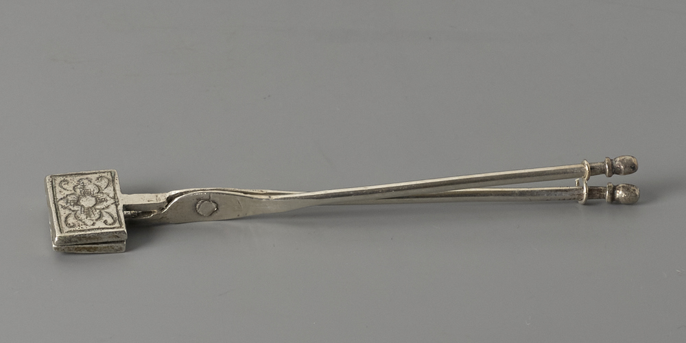Wafelijzer met twee rechthoekige platen die aan beide buitenzijden zijn gegraveerd met een bloem in een kader, binnenzijde met vierkant wafelmotief, geklonken draaipunt, platte benen eindigend in een knop.
