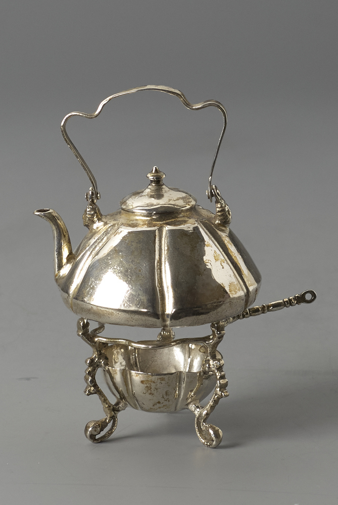 stadskeur onderzijde theepot: wapen van Amsterdam met een (uitgebreide)kroontje; vermoedelijk vervaardigd tussen 1718 en 1734