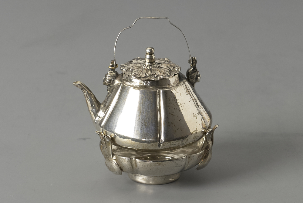 - gehalteteken hengsel en in de rand van de theepot,: Z II gehalteteken, 835/1000 in gebruik sinds september 1953