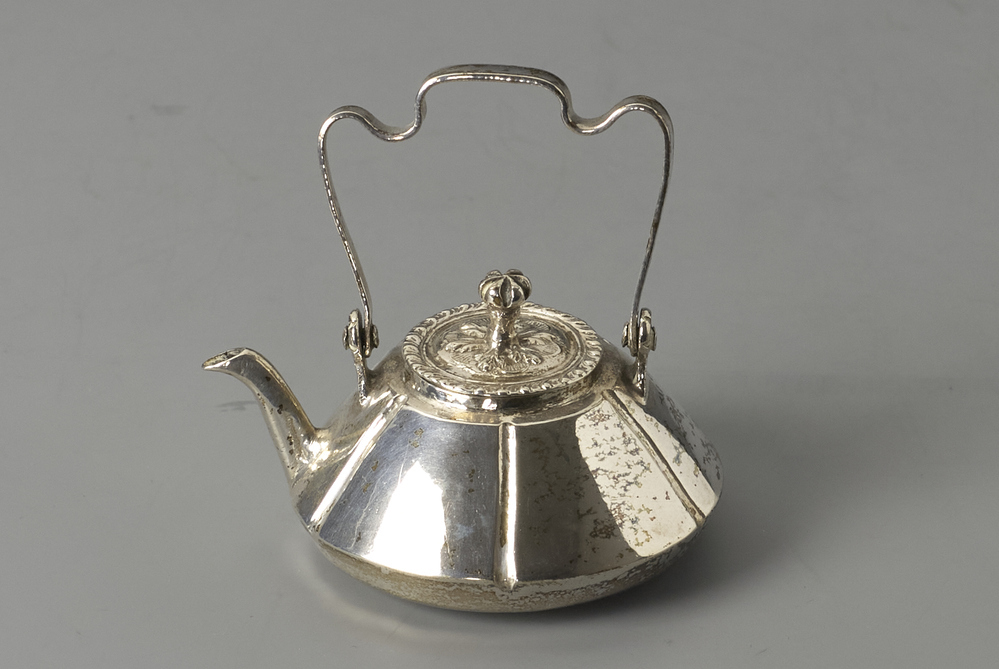Ronde waterketel met zeslobbige wand met geslingerd, scharnierend hengsel en C-vormige tuit.