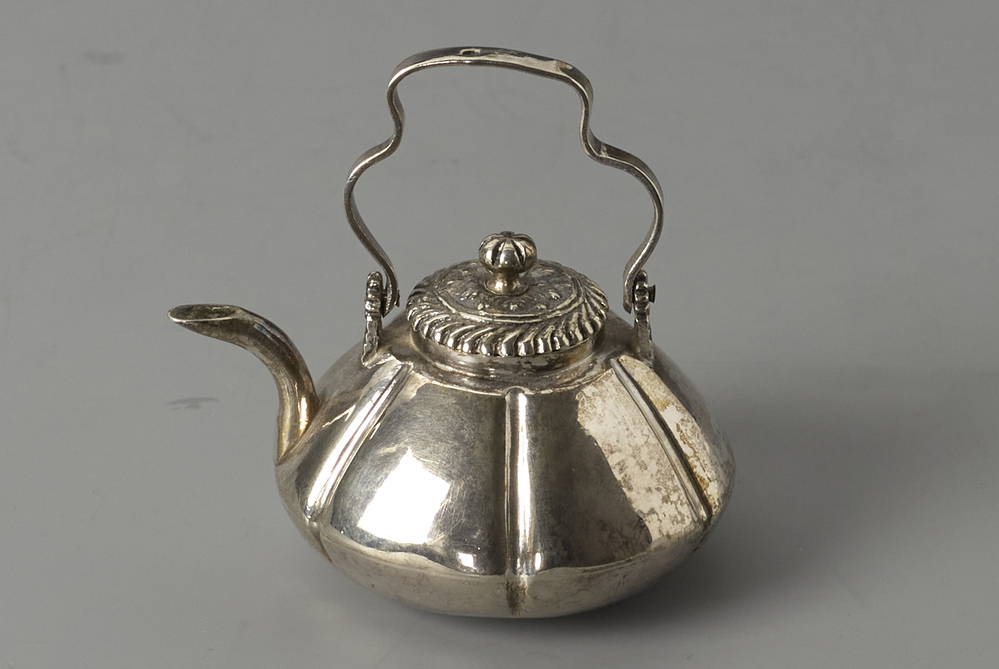 Waterketel met zeslobbige wand met golvend scharnierend hengsel en C-vormige tuit.