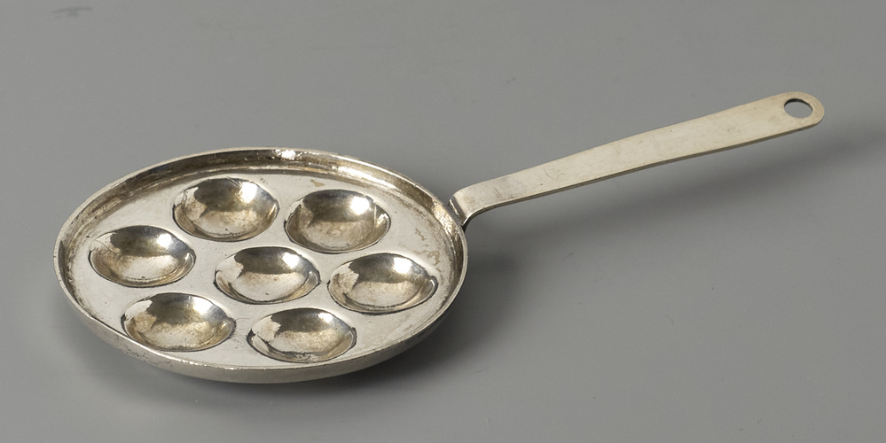 Ronde lage pan voor 7 poffertjes met een platte aangezette steel met ophangoog.- Trefwoorden