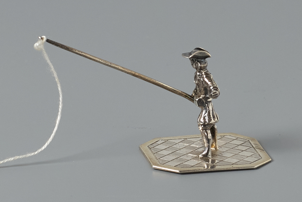 Man met in zijn rechterhand een lange stok om te vissen (?)