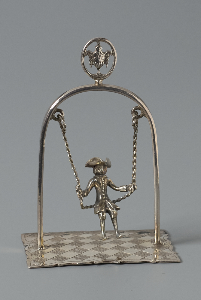 Gecontourneerde grondplaat met ruitmotief, hierop een kind/man op een schommel. Schommel bekroond met een vaas.