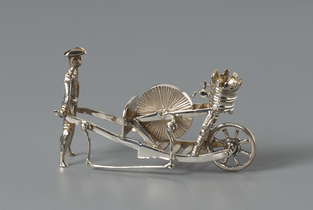 Scharensliep achter kruiwagen, waarop een grote steen met trapbediening, boven de steen op een plankje een vaatje met een kraantje.