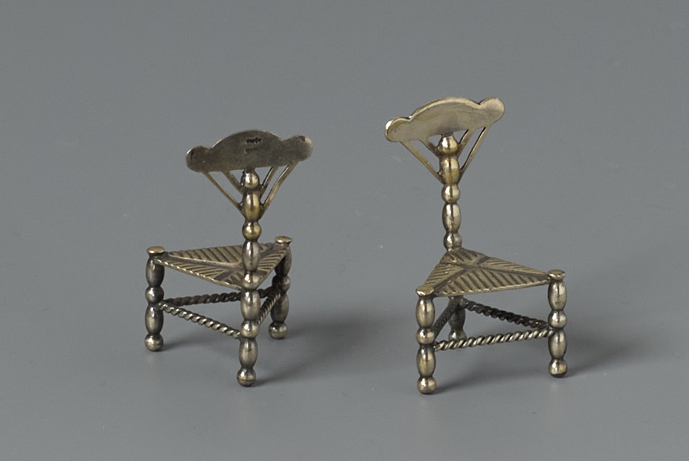 Een tweetal stoelen op drie poten en T-vormige leuningen en gevlochten zittingen.- Trefwoorden