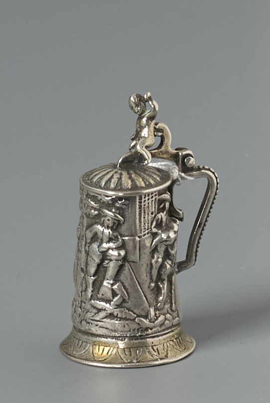 Bierpul met veel relief op wand en kleine bachus op het deksel.- Trefwoorden