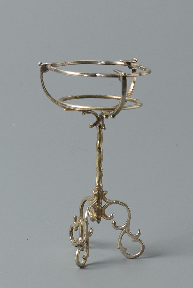 Komfoor op een gedraaide stam, die uitloopt in een driepoot. Op de stam komen drie armen samen die twee draagringen steunen.