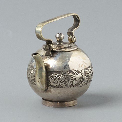 Waterketel, 1854 - 1855 Sneek zilver hoogte: 3.82 cm; breedte: 2.88 cm; diepte: 3.66 cm; gewicht: 19.55 gr; gehalteteken onderzijde ketel, rand deksel, binnenzijde hengsel.: zwaardje, geribbeld handvat, 1906-1953, beide gehalten