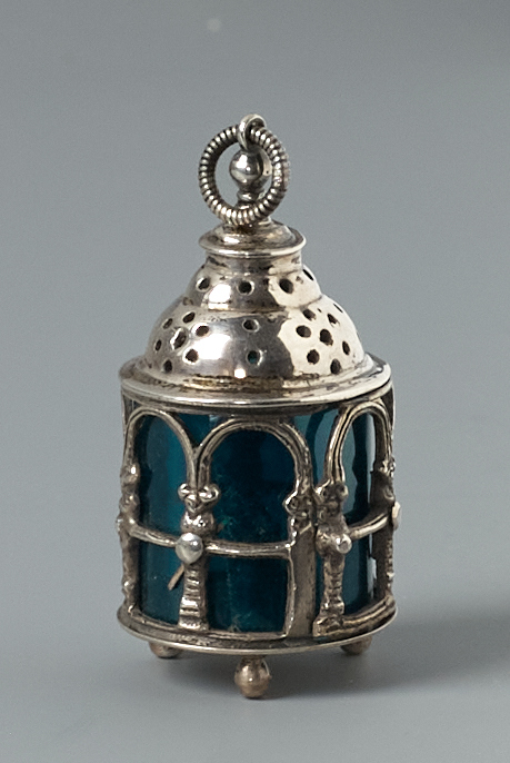 Ronde lantaarn op drie bolpootjes met een kaarsenhouder, 7 boogvensters, koepelvormige bovenzijde met luchtgaatjes bekroon met ronde knop met oog en ophangring.- Trefwoorden