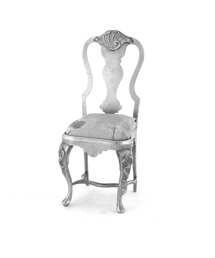 Stoel, 1775 Amsterdam zilver, zijde hoogte: 6.22 cm; breedte: 2.78 cm; diepte: 3.74 cm; gewicht: 16.12 gram; meesterteken achterzijde kap-rugblad: PS: PS in vierkant