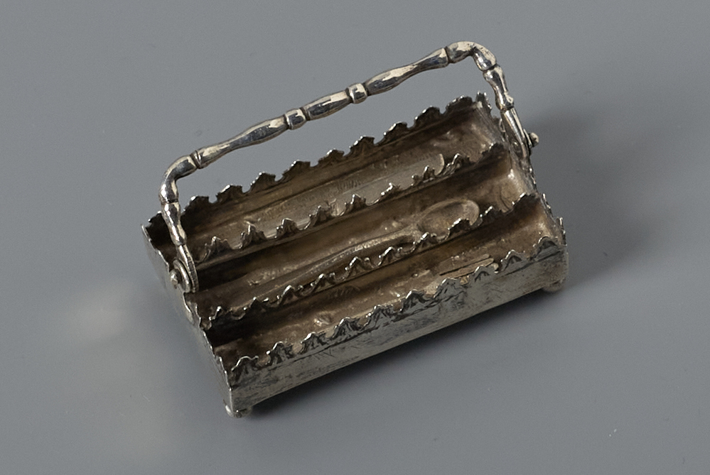 Bestekbak met gekartelde rand, verdeeld in drie vakken, staand op bolpootjes en scharnierend hengsel, daarin een lepel, vork en mes. ( bak van her-gebruiktzilver)- Trefwoorden