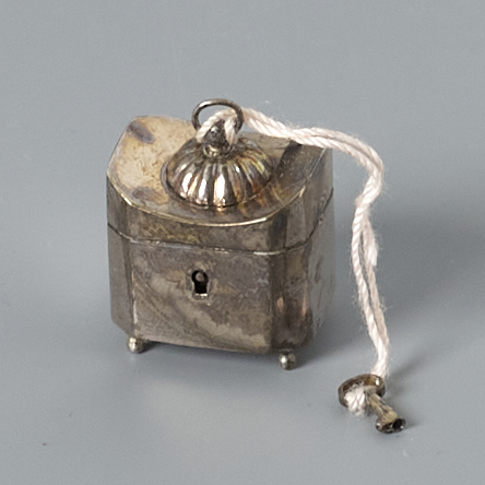 Theekistje, 1845 - 1857 Groningen zilver hoogte: 2.71 cm; breedte: 2.05 cm; diepte: 1.78 cm; gewicht: 8.78 gr; gehalteteken zijkant deksel: Zwaardje, ongeribbeld handvat, 1814-1906