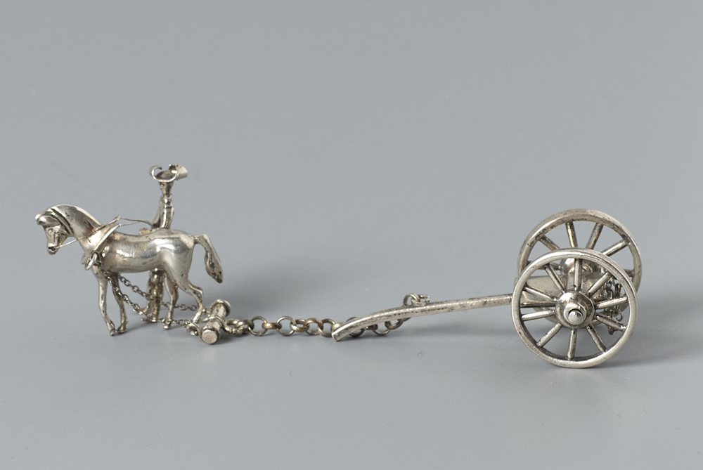 Eenvoudige kar met boom, ketting waarraan een paard met gareel en een man rechts van het paard met de teugels.