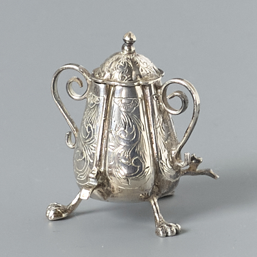 Kraantjeskan, de wand 6 lobbig en gegraveerd, twee s-vormige oren, staand op drie klauwpootjes en met drie kraantjes.
