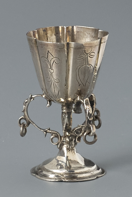 Beker op ronde, zeslobbige voet, versierd met renaissance motieven.