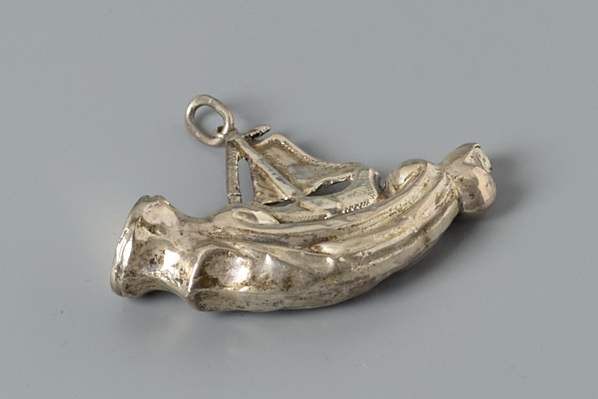 Hanger in identieke vorm als voor een sigarenpijpje versierd met een schip en ophangoog op de masttop