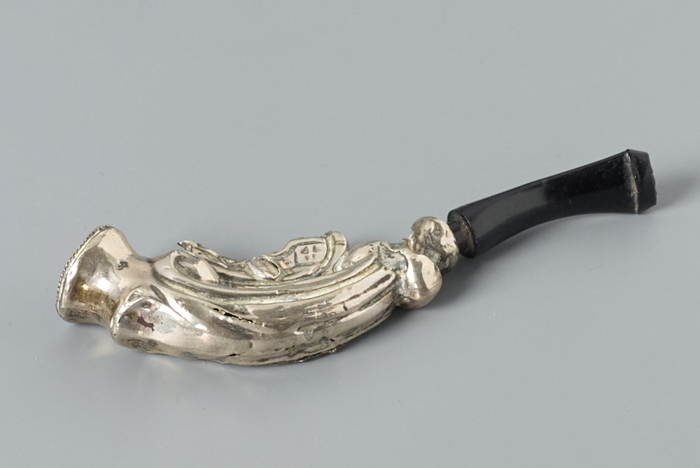 Sigarenpijpje Schoonhoven/Nijmegen zilver, kunststof? hoogte: 2.50 cm; breedte: 1.42 cm; diepte: 9.30 cm; gewicht: 4.70 gr; gehalteteken zijkant, tussen 2 "krullen": Zwaardje, geribberld handvat. Deels aanwezig.