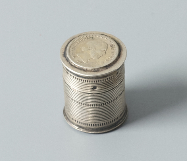 - belastingteken Buitenzijde zijkant koker, rand dop: Een dolfijntje in en contour : Ongewaarborgde inlandse werken, 2 formaten, 1859-1893