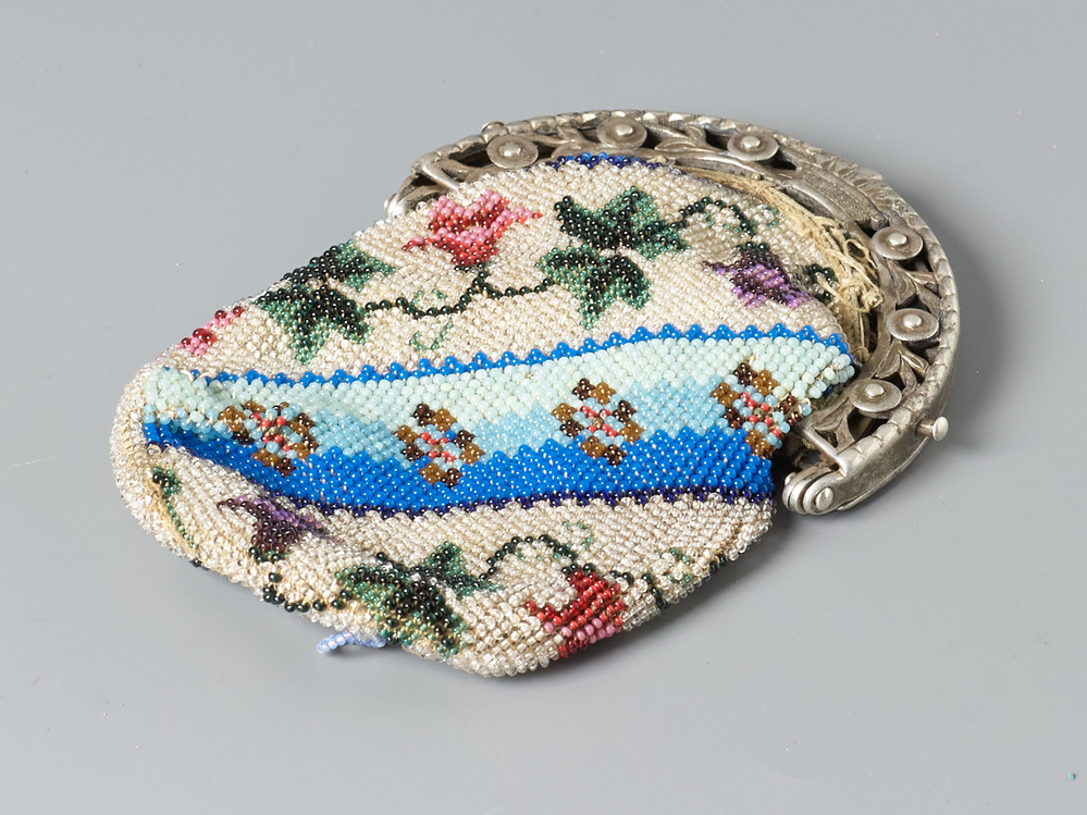 Opengewerkte, halfronde beursbeugel met gestyleerde bloemen.