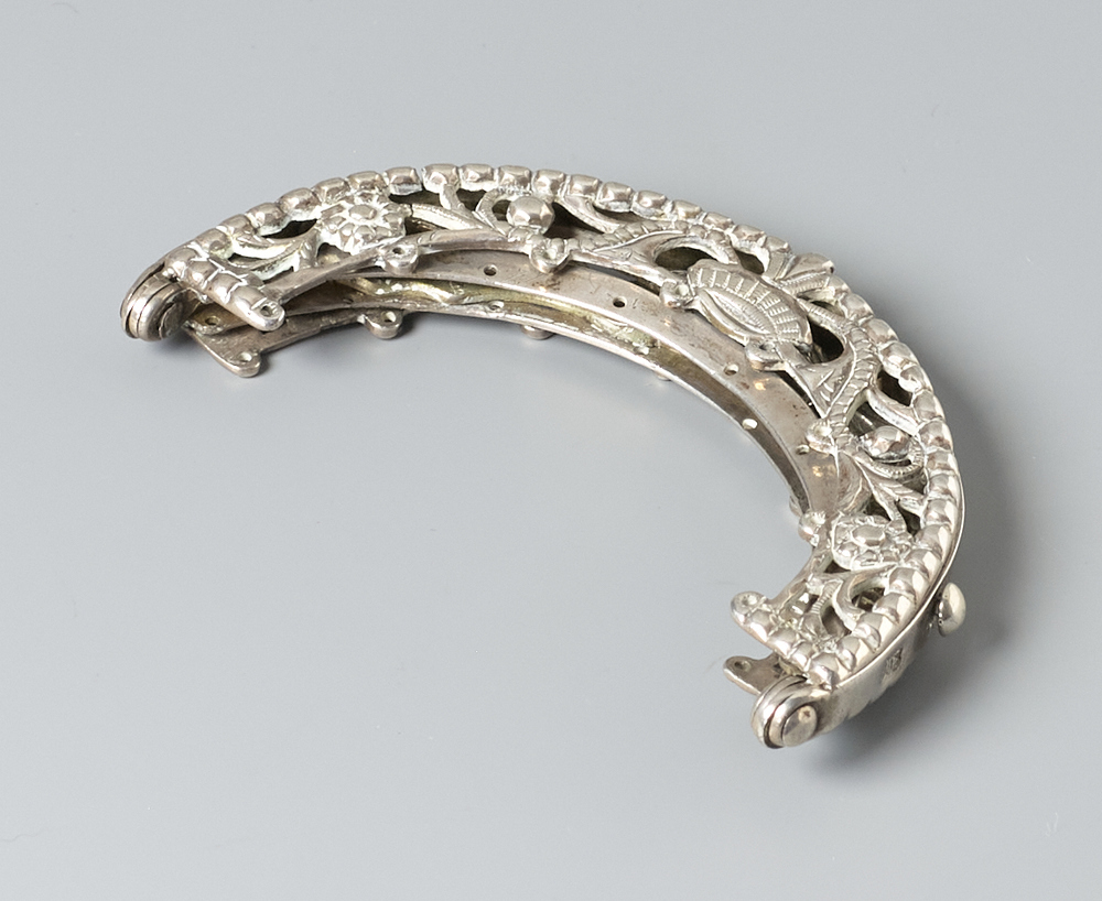 Opengewerkte, halfronde beursbeugel versierd met bloemen.