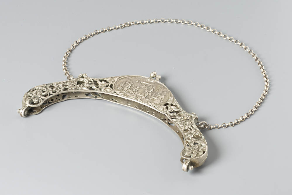 Halfronde, opengewerkte tasbeugel met scharnierende buitenbeugel aan een ketting.