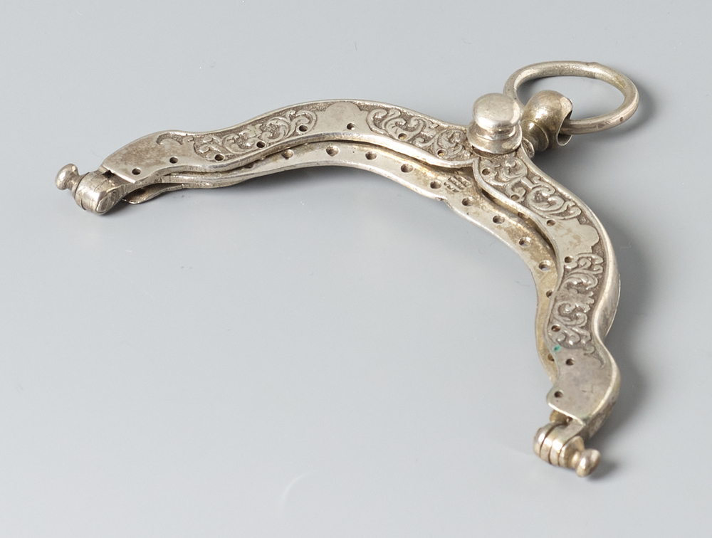 Boogvormige tasbeugel versierd met gestyleerde bloemmotieven.